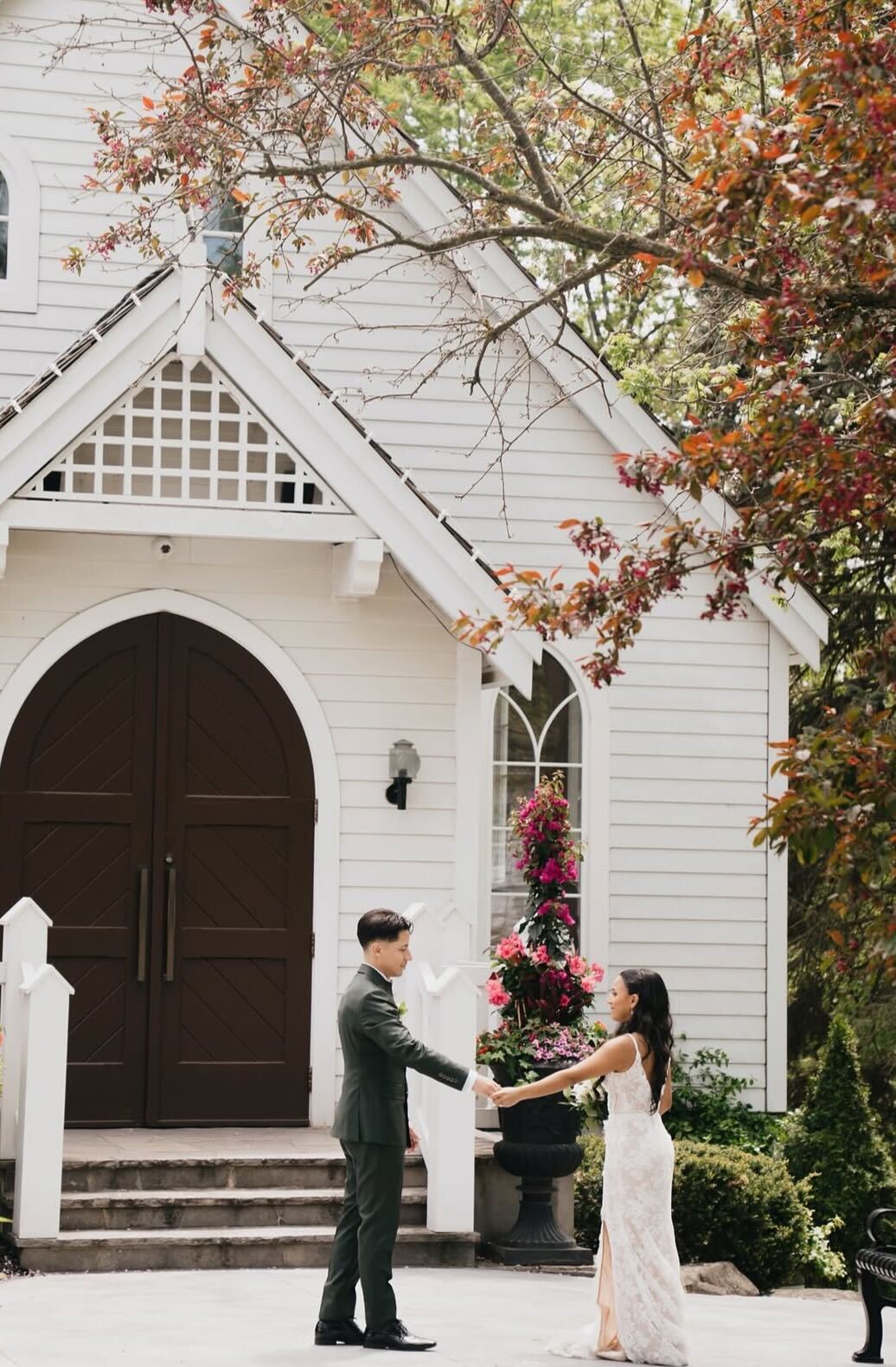 A: Our wedding day, May 18, 2025, at The Doctor’s House in Kleinberg, Ontario, was truly magical. The morning was calm and relaxed—without a bridal party, we didn’t have to start super early or coordinate a large group. I had curated playlists for every part of the day, blending favorite songs with wedding classics to set the perfect mood.